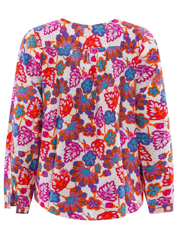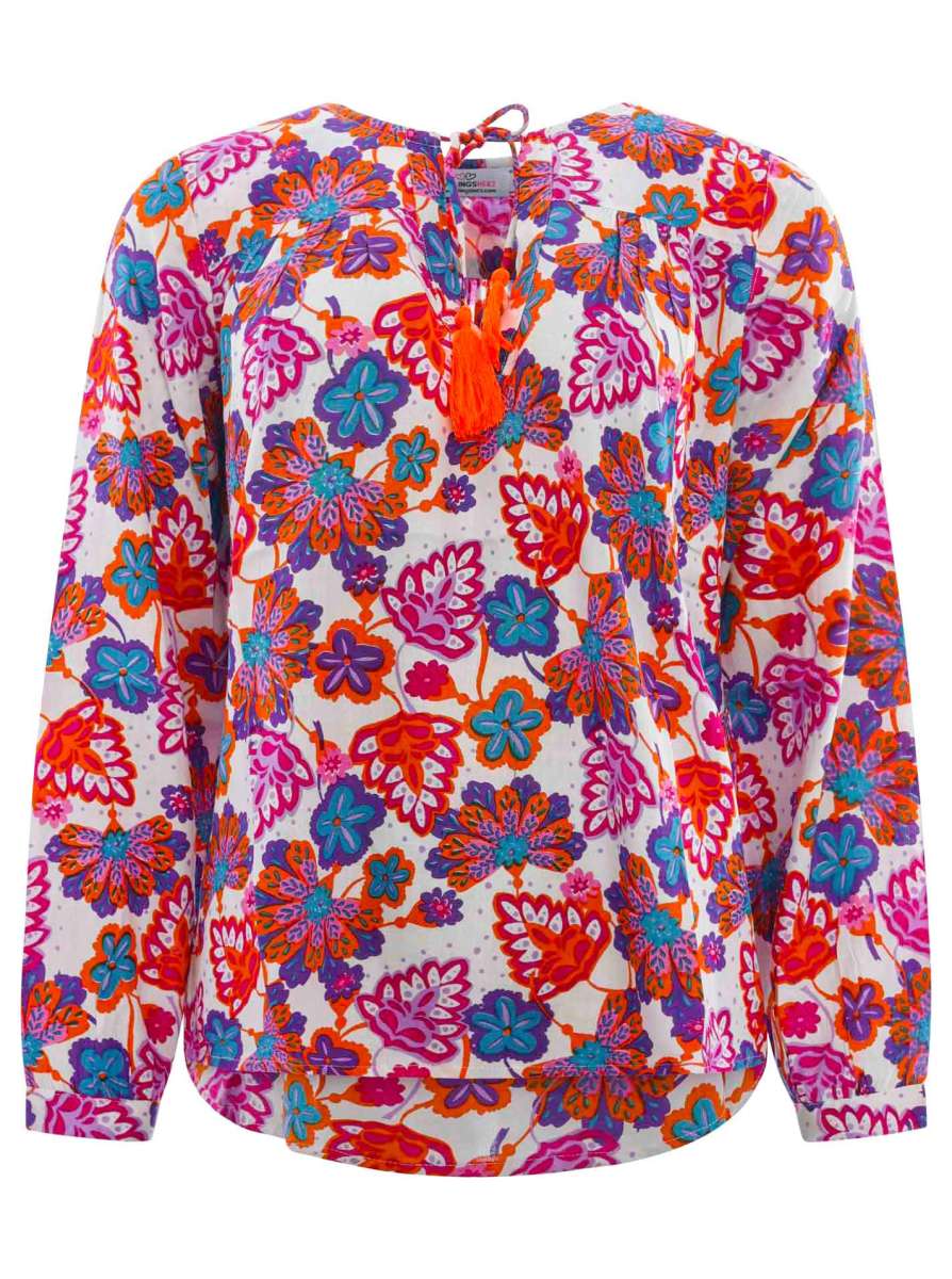 Die Bluse mit Blumenmuster, verziert mit Tasseln und einem elastischen Bund an den Armen, ist perfekt fĂĽr den Urlaub. Hergestellt aus 100 % Viskose, bietet sie eine flieĂźende Passform und hohen Tragekomfort. Diese Bluse verleiht deinem Look eine frische und feminine Note.