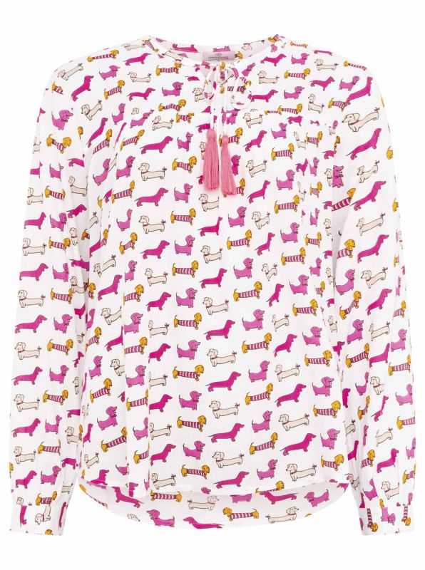 Die Zwillingsherz Bluse "Comic Dackel" begeistert mit einem stylischen, verspielten Dackel-Print. Der lockere Schnitt und der hochwertige Stoff sorgen für besten Tragekomfort – ein modischer Hingucker für jeden Anlass!