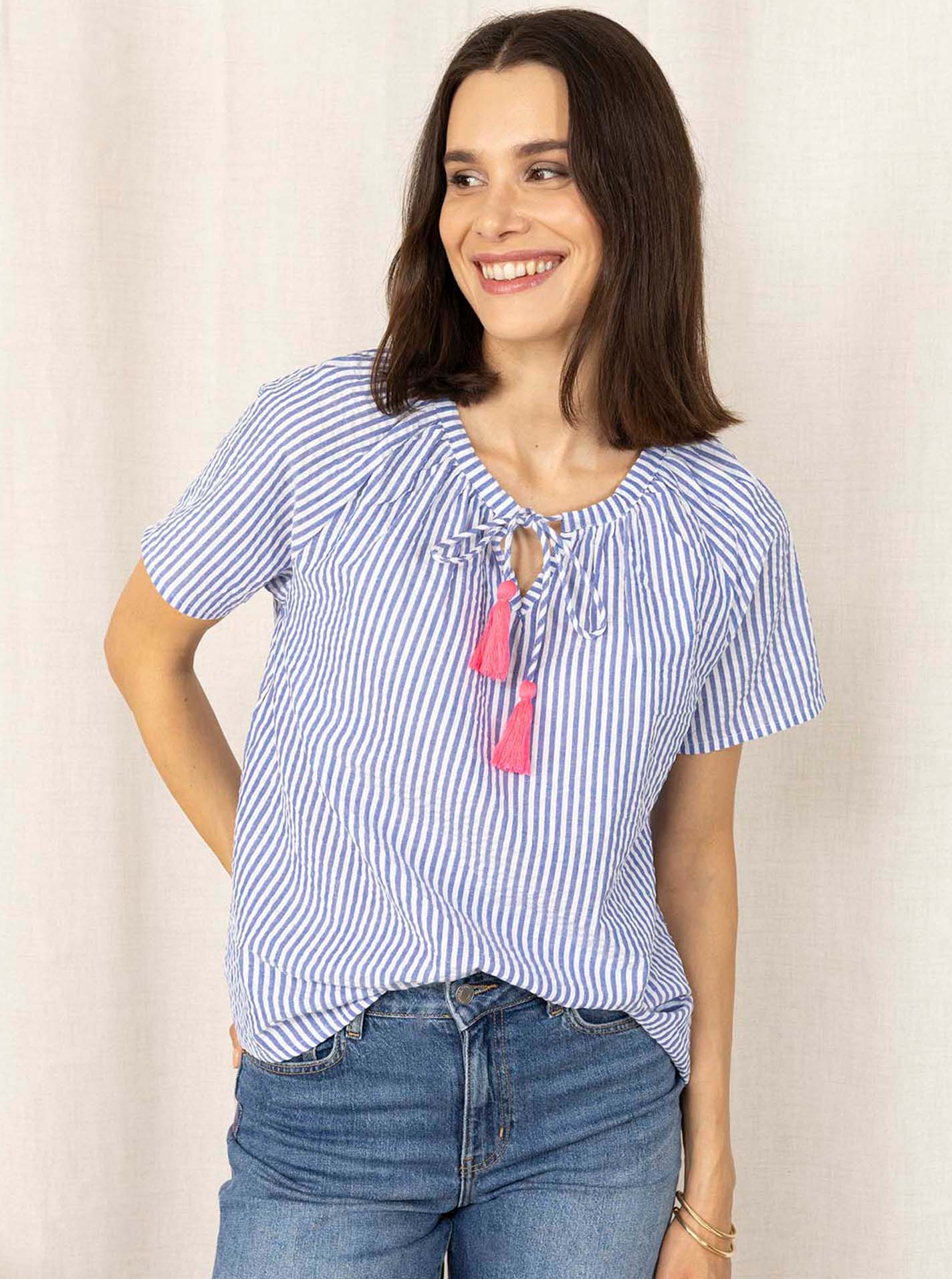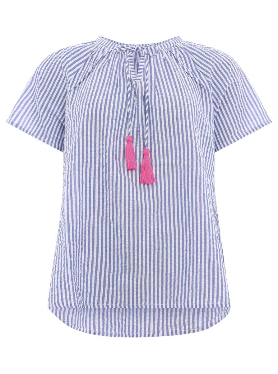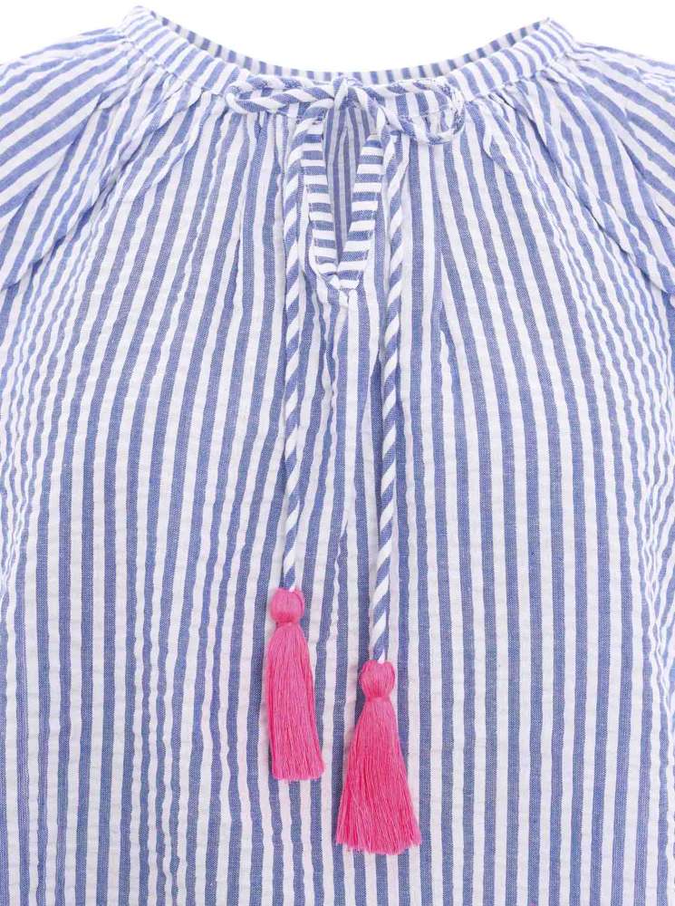 Eine luftige Musselin-Kurzarmbluse mit einem frischen Streifenmuster, akzentuiert durch eine trendige Kordel mit Neon-Tasseln. Die reine Baumwollzusammensetzung verleiht ein angenehmes TragegefĂĽhl und sorgt fĂĽr ein leichtes, stylisches Statement.