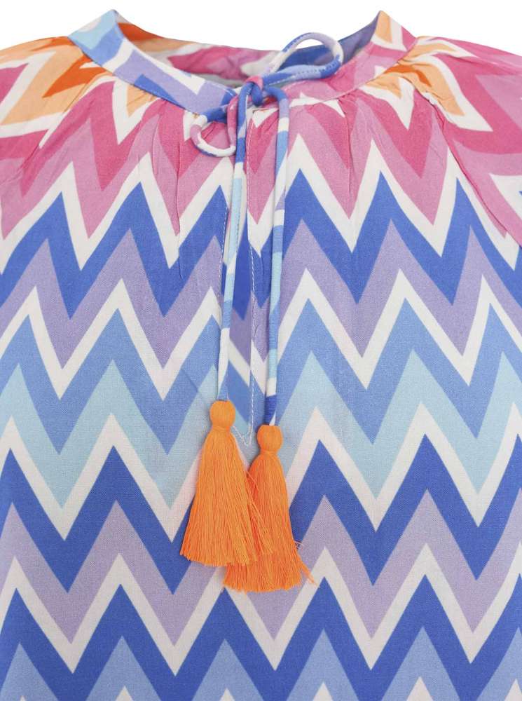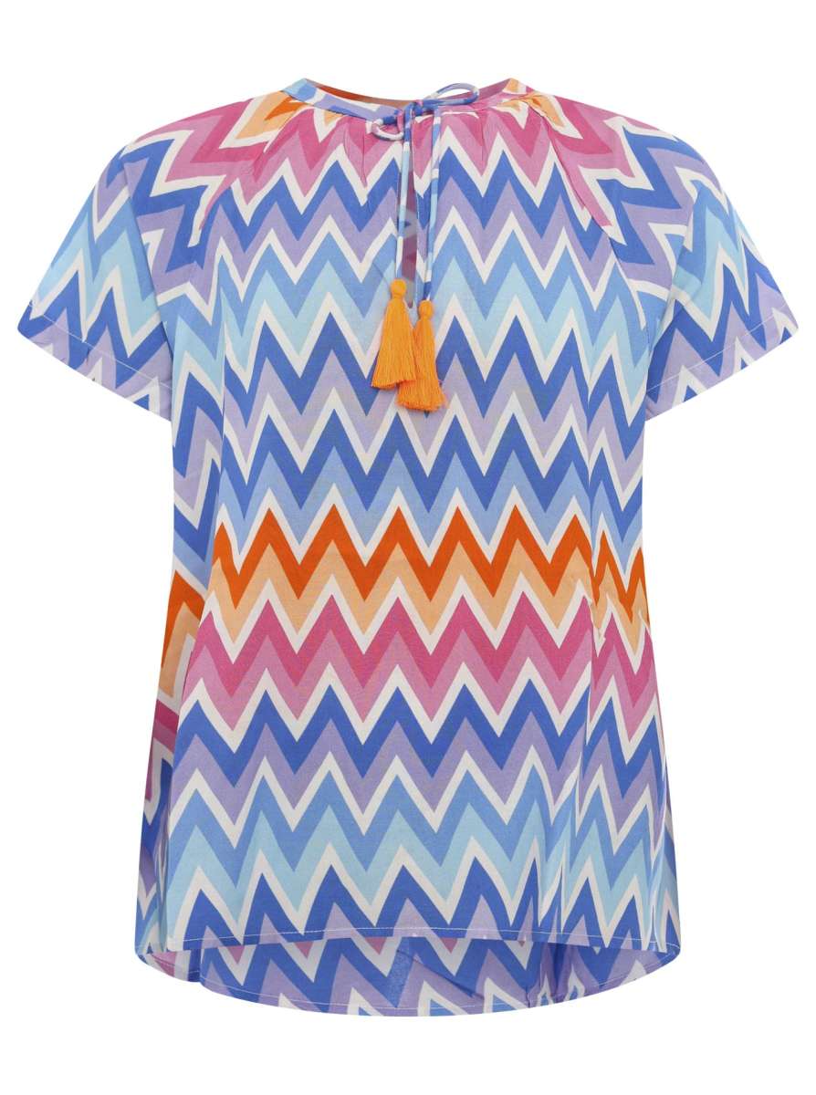 Ein stilvolles Kurzarmblusen mit einem lebendigen Zickzackmuster. Die schicke Kordel mit Tasseln setzt einen trendigen Akzent. Hergestellt aus 100 % Viskose bietet die Bluse nicht nur ein ansprechendes Muster, sondern auch angenehmen Tragekomfort.