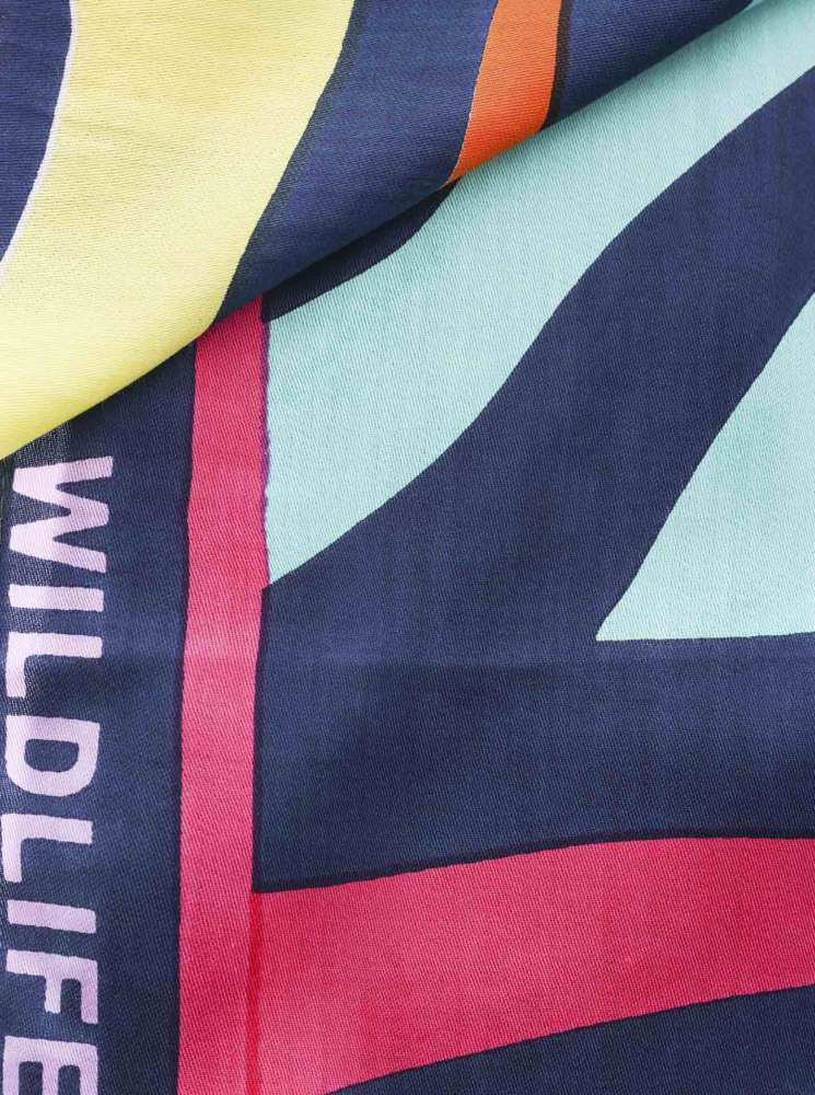 Ein nachhaltiges Vierecktuch mit einem auffälligen Zebramuster, verziert mit trendigen Tasseln und dem motivierenden Schriftzug "Wild Life". Hergestellt aus 100% organischer Bambus-Viskose, vereint es Stil und Umweltbewusstsein in einem Accessoire.