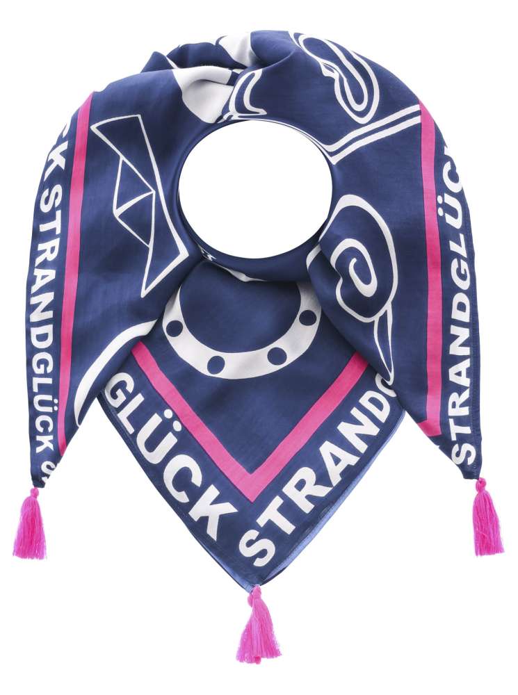 Ein nachhaltiges Vierecktuch mit maritimem Muster und dem Schriftzug "Strandglück". Hergestellt aus 100 % Organic Bambus-Viskose für einen angenehmen Tragekomfort.