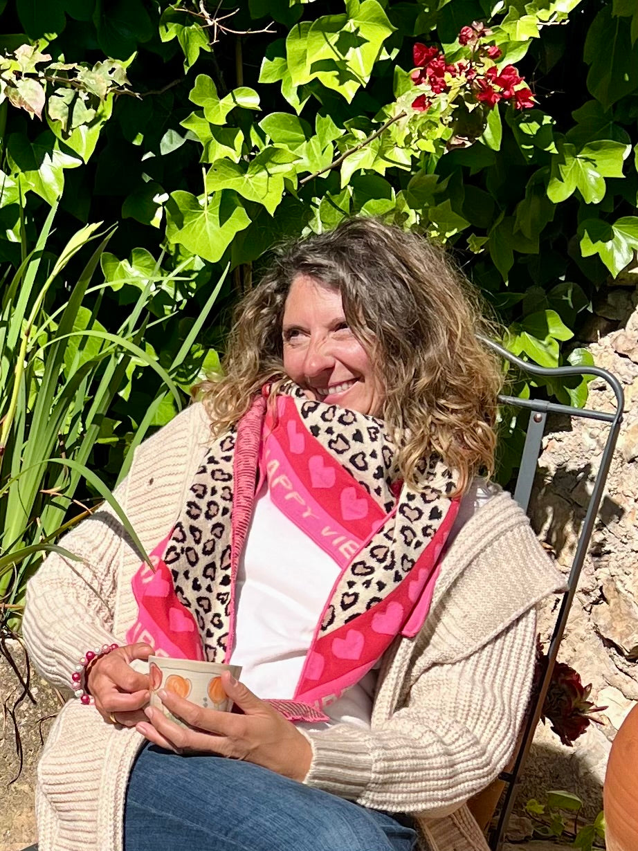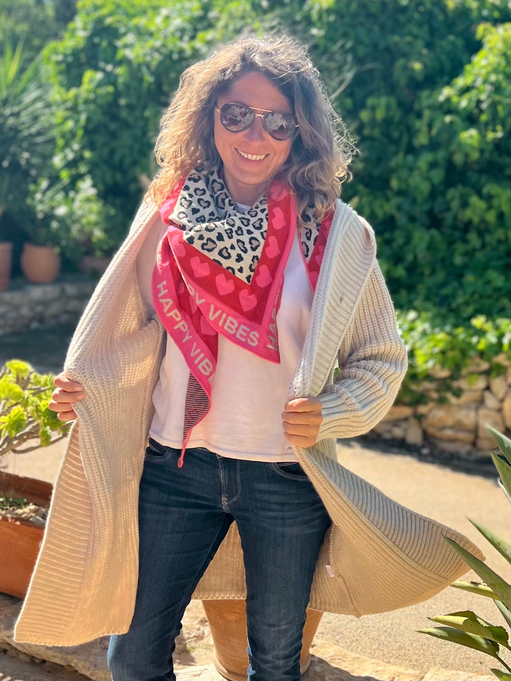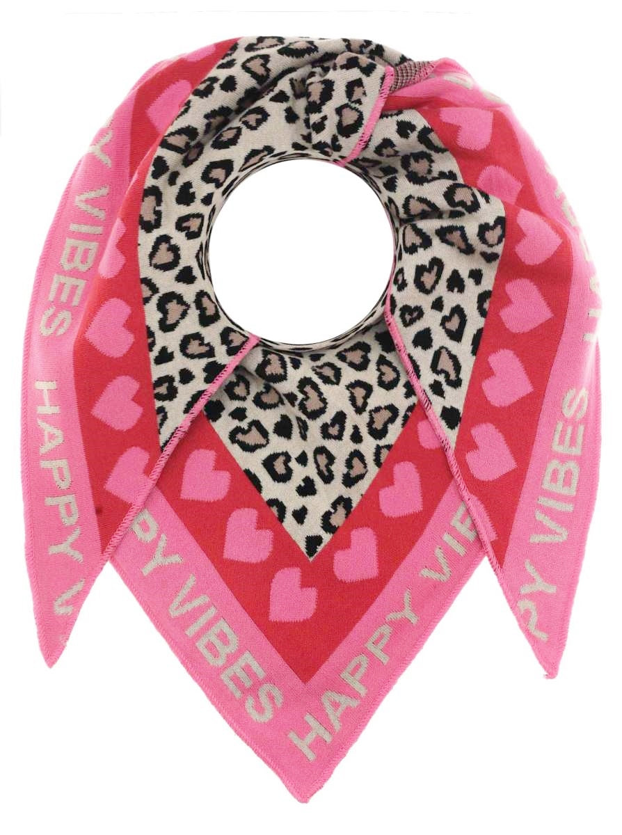 Das Dreieckstuch ist dank seines hohen Baumwollanteils super weich und wärmend. Das übliche Leopardenmuster, wird durch das besondere Herzdesign zu einem richtigen Hingucker. Am Rand zieht sich außerdem der Schriftzug "Happy Vibes" zusammen mit grauen Herzen entlang. Das Material setzt sich aus 50 % Baumwolle und 50 % Polyacryl zusammen.