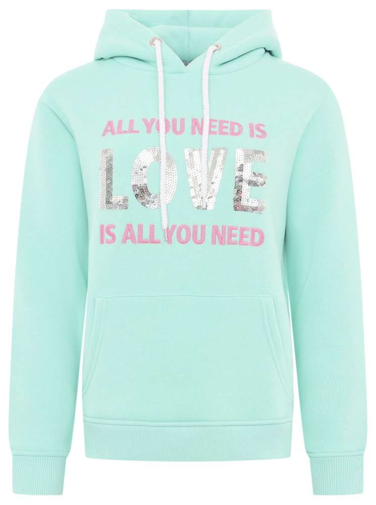 Stilvoller Hoodie mit der aufwendigen Stickerei "All You Need is Love" und glitzernden Pailletten für einen Hauch von Eleganz. Die Kapuze und die praktischen Fronttaschen verleihen diesem Hoodie den idealen Mix aus modischem Design und Funktionalität. Gefertigt aus einer angenehmen Mischung aus 50% Baumwolle und 50% Polyester, bietet er ein erstklassiges Trageerlebnis. Mit Fleece-Innenfutter.