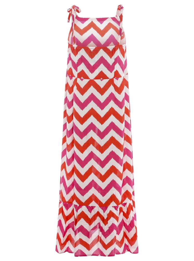 Sommerliches Maxikleid mit trendigem Zickzackmuster und verstellbaren Trägern für individuelle Styles. Die leichte Viskose-Materialzusammensetzung sorgt für angenehmen Tragekomfort und macht dieses Kleid zum perfekten Begleiter für warme Tage.