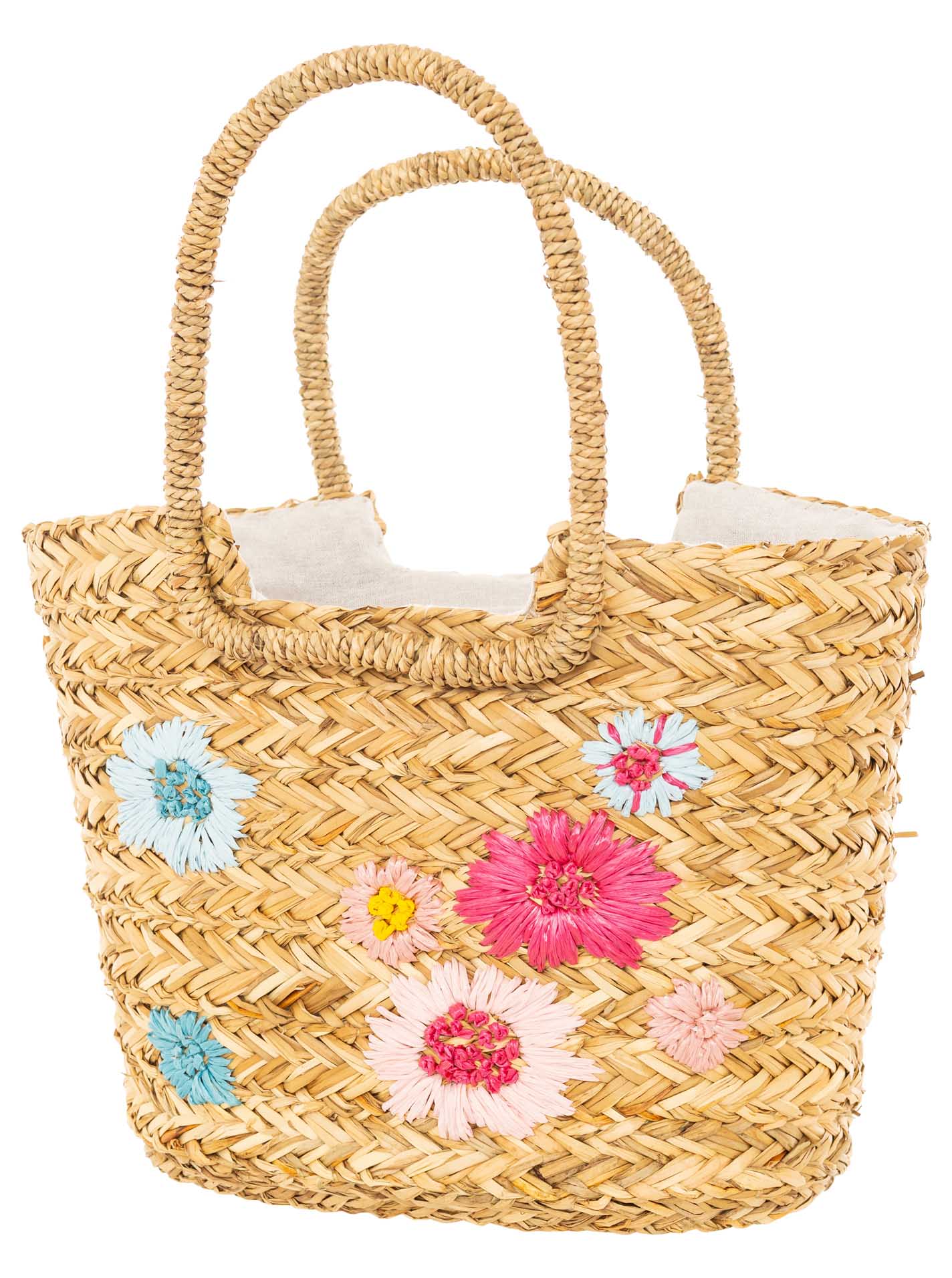 Strohtasche "Flowers" mit floralem Design und praktischem Tragegriff. Das leichte, natürliche Material macht sie zu einem sommerlichen Begleiter für Alltag und Freizeit.
