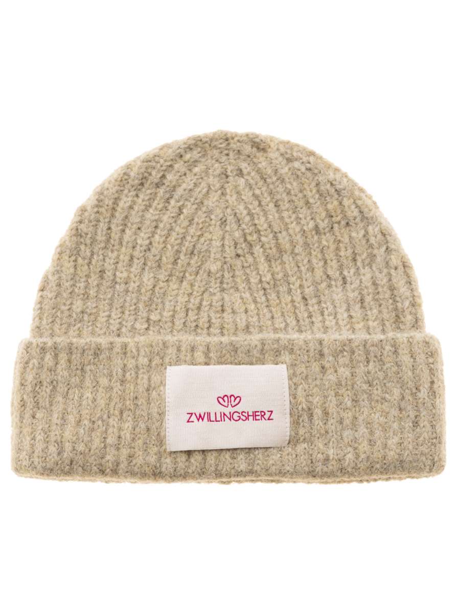💕 Zwillingsherz Mütze Umschlagmütze "Zwillingsherz Patch" Wolle gerippt Beige