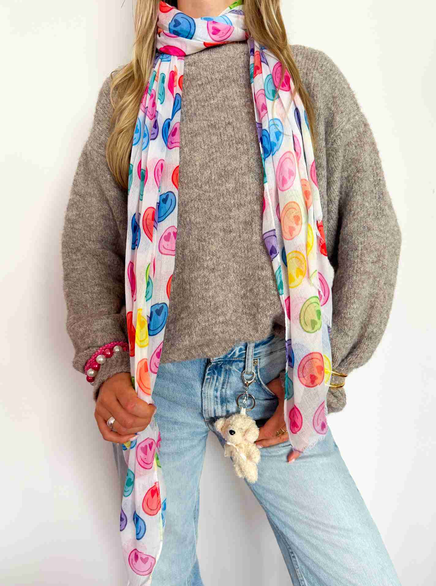 Unser Zwillingsherz Schal "Smiles" – Fröhlich, weich und ein echter Gute-Laune-Garant. Die verspielten Smileys machen diesen kuscheligen Schal zum perfekten Begleiter für stylische und positive Winterlooks.
