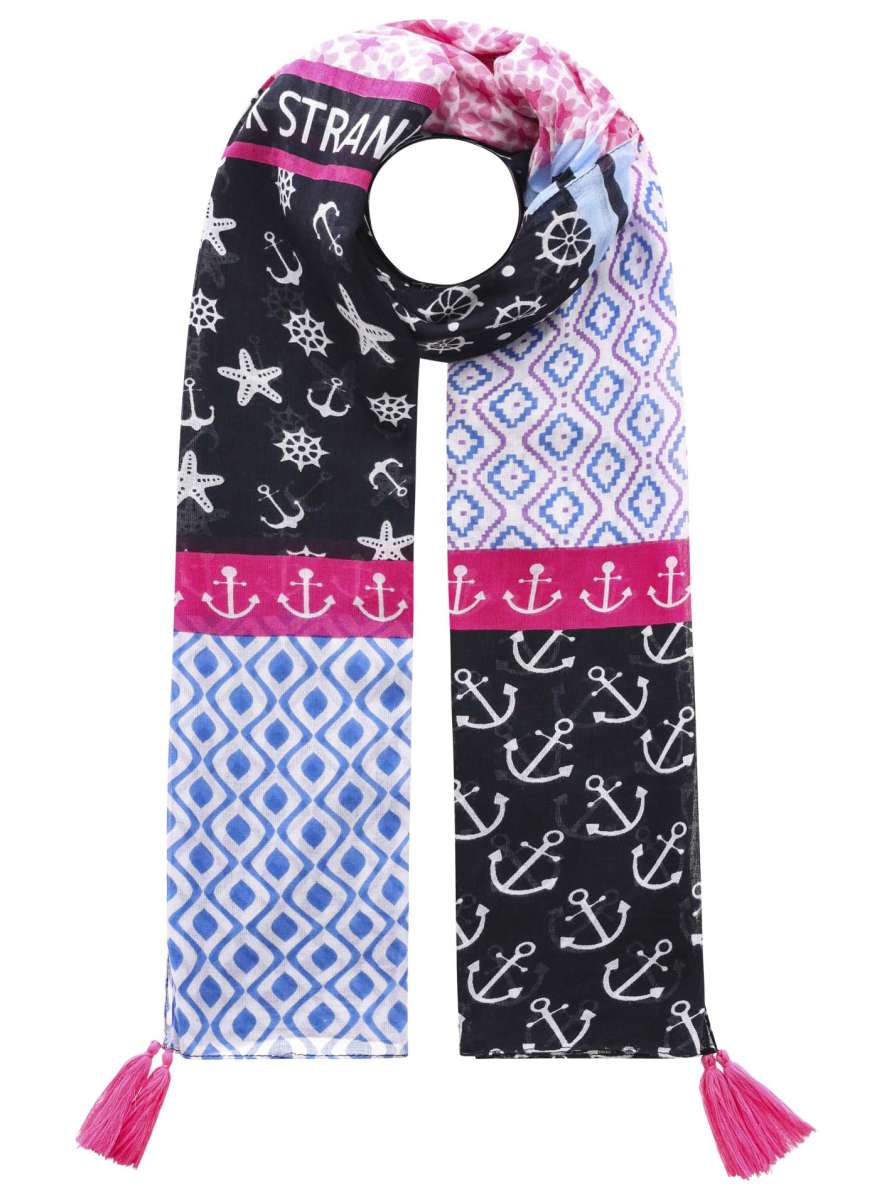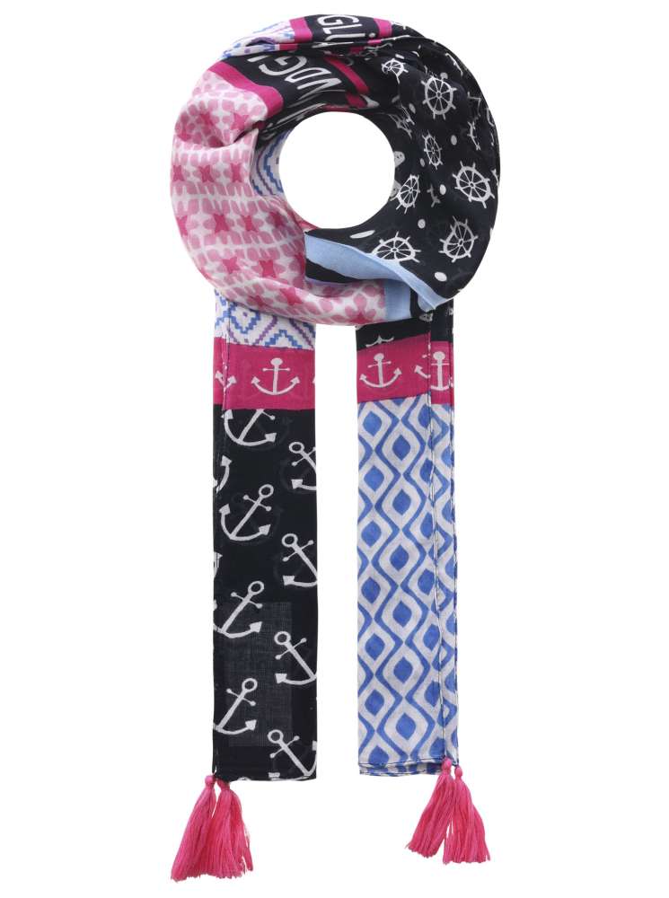 Unser Schal kombiniert maritimes Flair mit modernen geometrischen Mustern, verziert mit fröhlichen Tasseln und dem aufmunternden Schriftzug "Strand Glück". Aus 100% Viskose gefertigt, für einen lässigen und stilvollen Look."