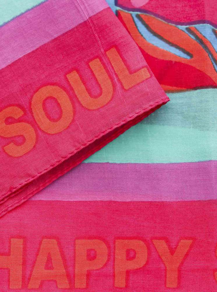 Ein charmantes Halstuch mit einem fröhlichen Blumenmuster, ergänzt durch den inspirierenden Schriftzug "Happy Soul". Die Materialzusammensetzung aus 80 % Baumwolle und 20 % Seide verleiht ihm einen angenehmen Tragekomfort und einen Hauch von Eleganz.