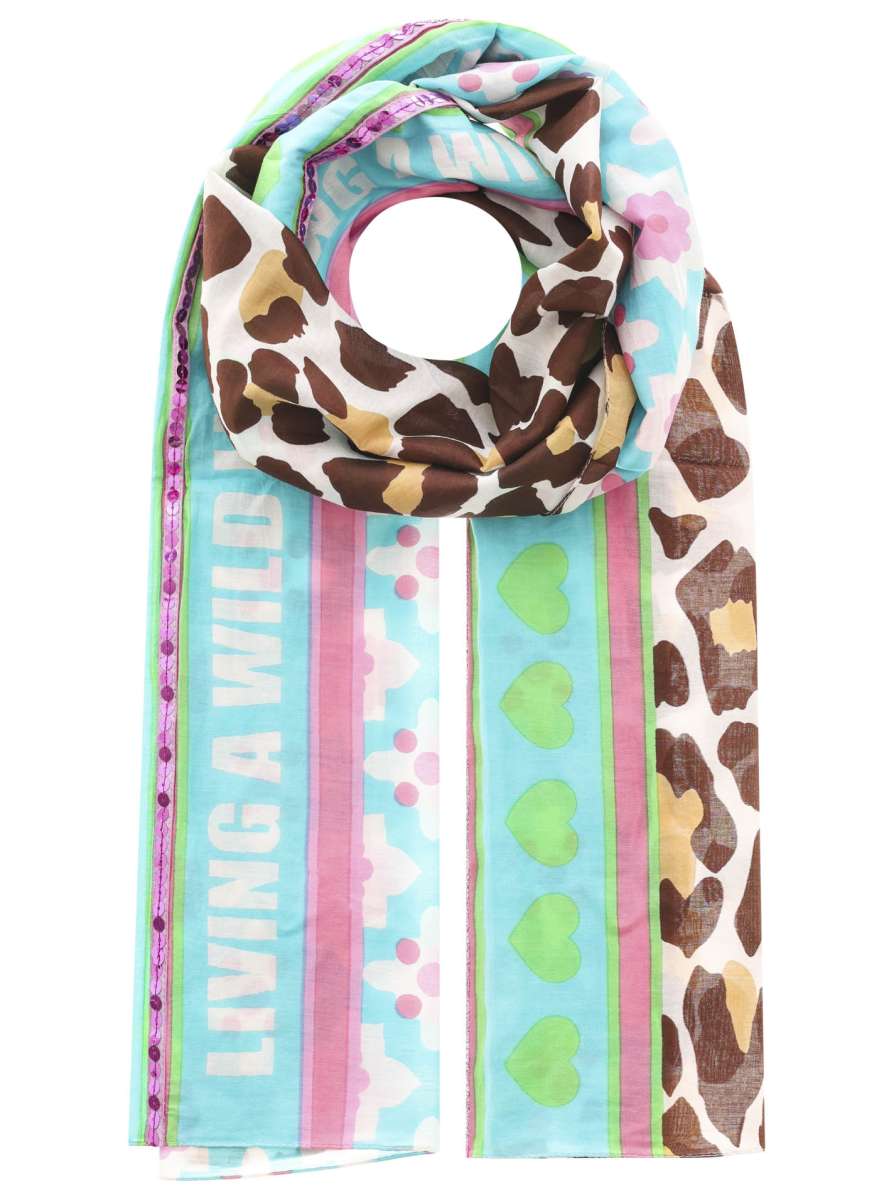 Der Schal "Wild Life" von Zwillingsherz vereint farbenfrohe Blumenmuster mit dem Schriftzug "Living A Wild Life" und einem dezenten Pailletten-Detail - ein besonderes Accessoire, das Ihrem Look eine individuelle und stilvolle Note verleiht.