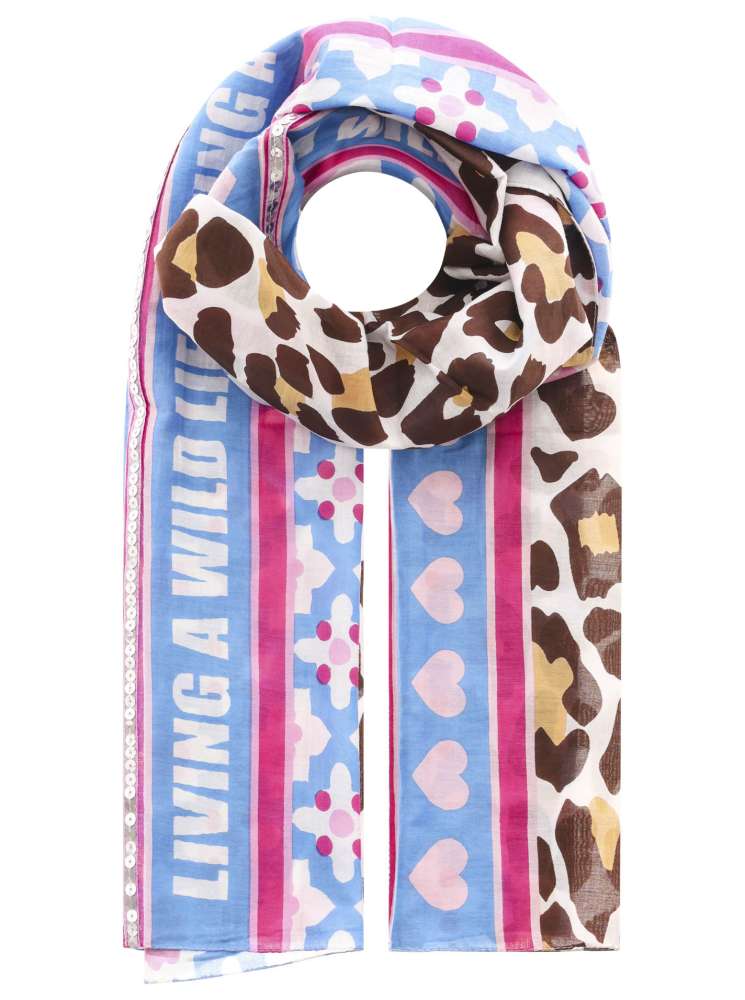 Der Schal "Wild Life" von Zwillingsherz vereint farbenfrohe Blumenmuster mit dem Schriftzug "Living A Wild Life" und einem dezenten Pailletten-Detail - ein besonderes Accessoire, das Ihrem Look eine individuelle und stilvolle Note verleiht.