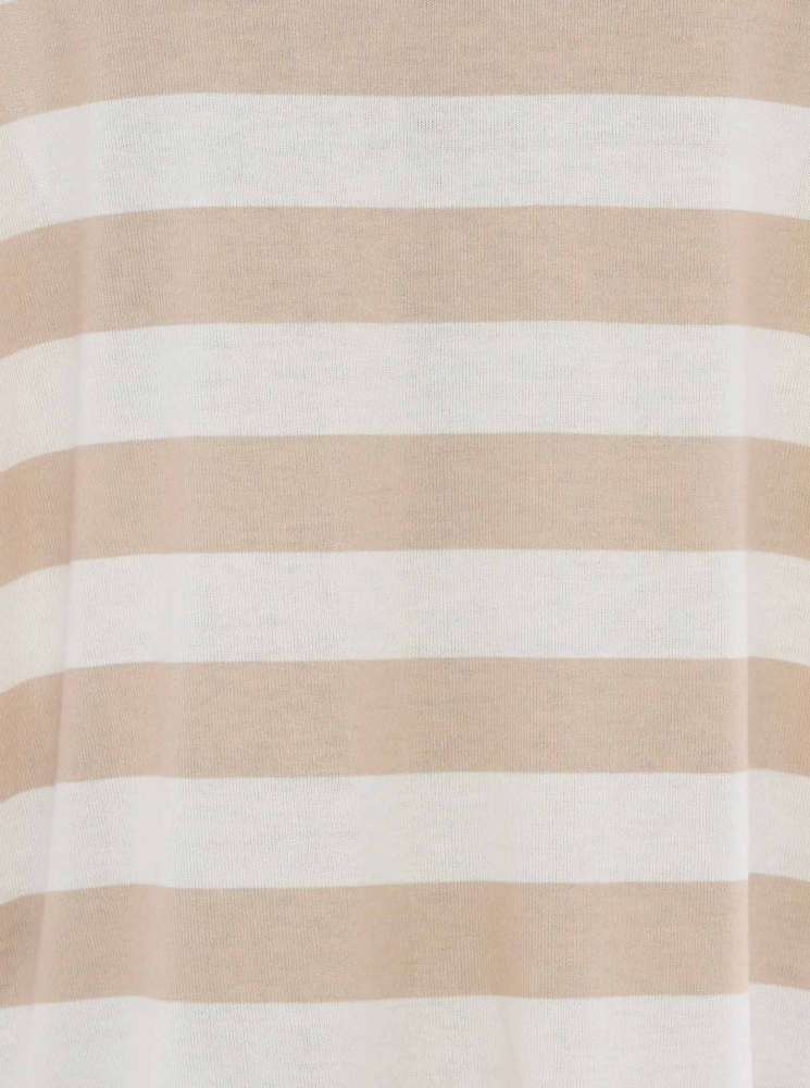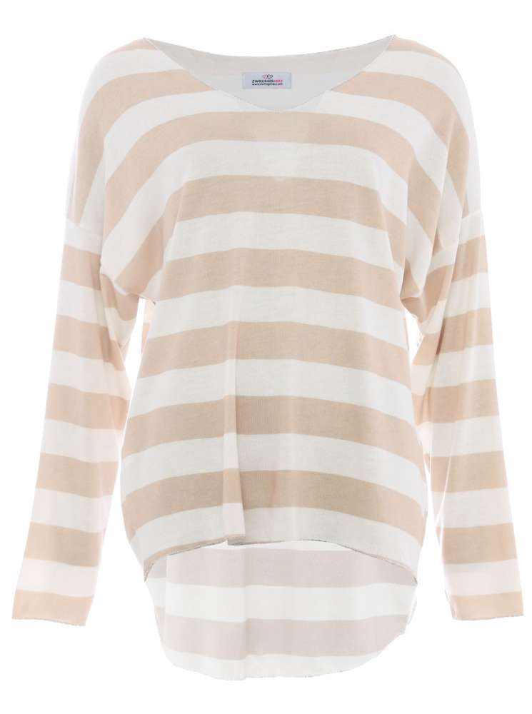 Das Langarmshirt hat einen breiten Ausschnitt mit einem dezentem Glitzerrand. Über das gesamte Shirt zieht sich ein breites Streifenmuster, bestehend aus Weiß und einer sommerlichen Farbe. Die Ärmel sind schmal geschnitten und hinten ist das Shirt außerdem länger geschnitten als vorne. Am unteren Bund befindet sich ebenfalls ein schmaler Glitzerrand, welcher das Shirt zu einem richtigen Hingucker macht.