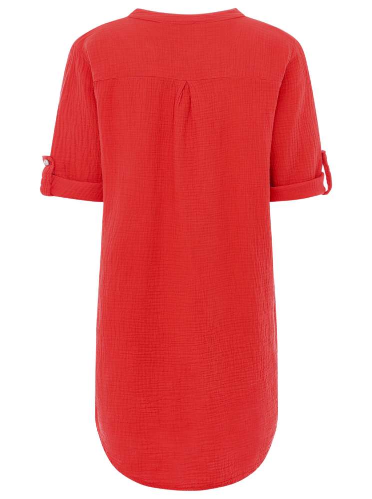 Die lange Tunika hat einen kleinen Kragen, sowie einen V-Ausschnitt. Die Ärmel kann man sowohl lang tragen, als auch aufgekrempelt mit Hilfe eines kleinen Knopfes. Hinten ist die Tunika außerdem länger geschnitten, als auf der Vorderseite. Die Materialzusammensetzung ergibt sich aus 100 % Baumwolle.