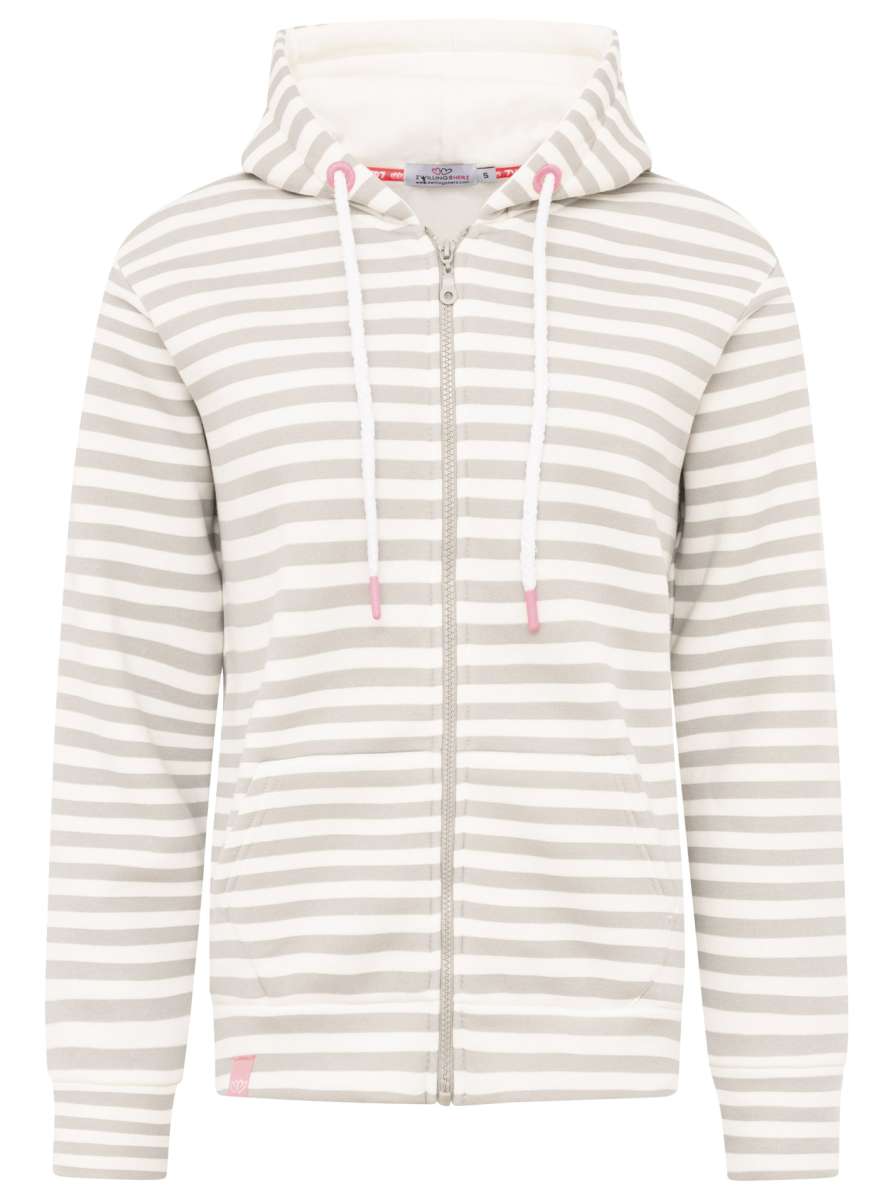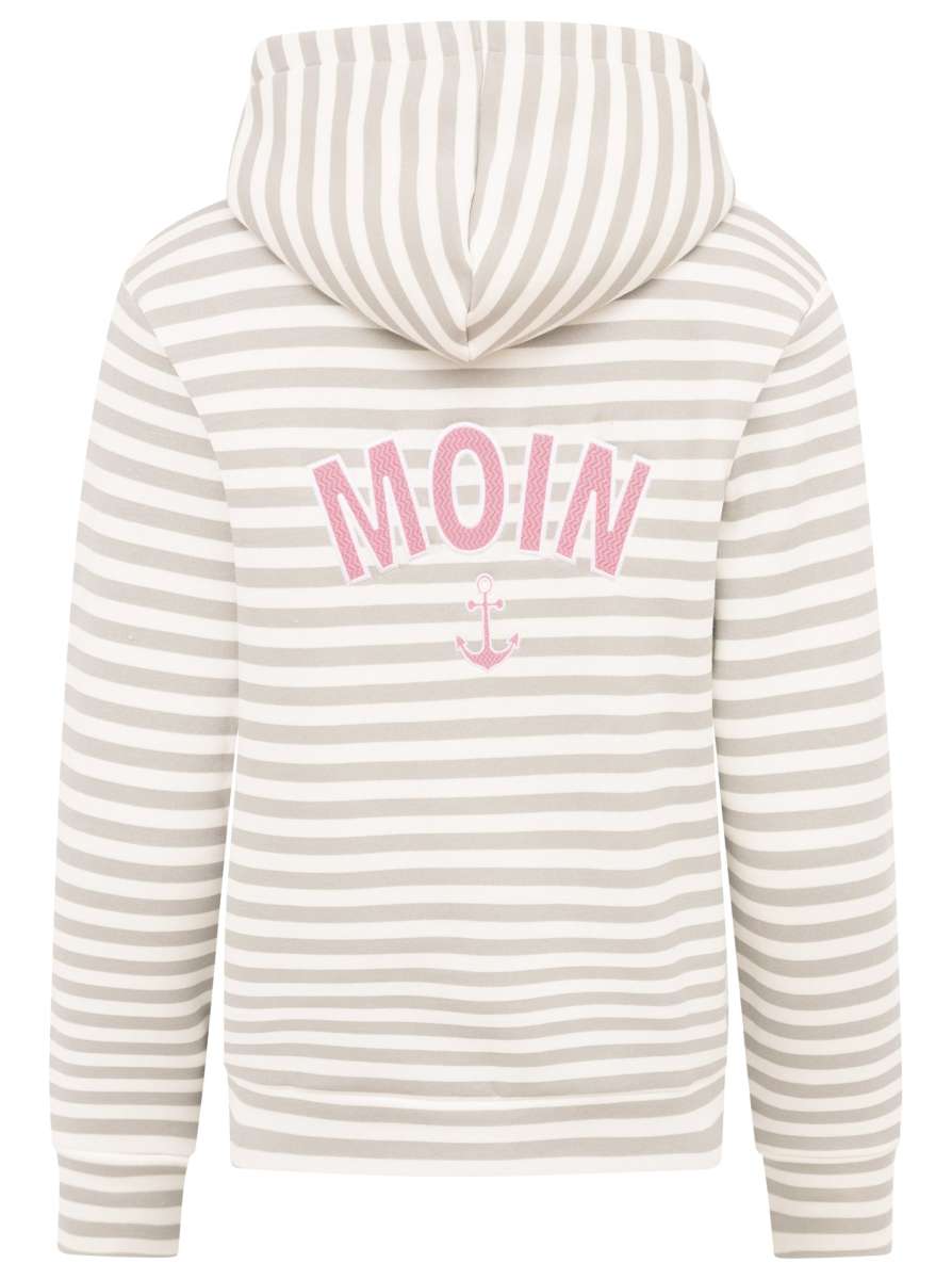 Die Hoodiejacke "Streifen Moin" überzeugt mit einem lässigen Streifen-Look und bietet gleichzeitig maximalen Komfort. Mit Kapuze, Kordelzug und praktischen Taschen ist sie der ideale Begleiter für entspannte Tage.