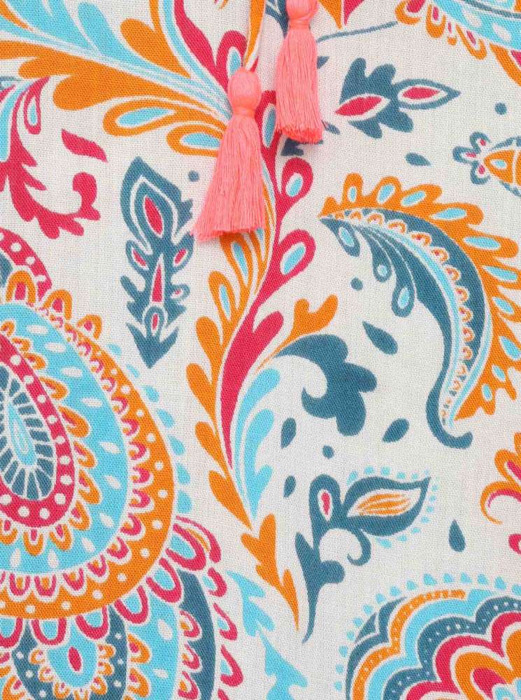 Diese leichte Bluse aus 100 % Viskose strahlt in schönen Frühlingstönen und ist zudem sehr angenehm auf der Haut. Sie hat süße Tasseln, sodass du sie vielfältig stylen kannst. Sie hat ein buntes Paisley Muster, welches dein Outfit garantiert auffrischen wird. Die perfekte Bluse für den Frühling.