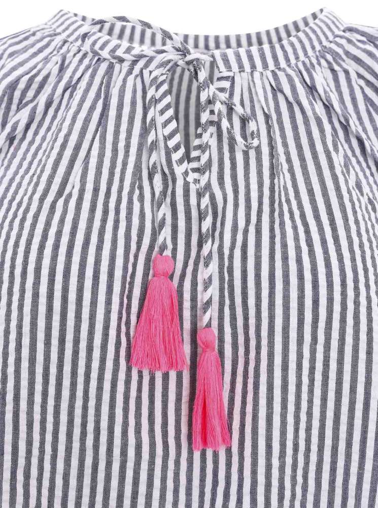Eine luftige Musselin-Kurzarmbluse mit einem frischen Streifenmuster, akzentuiert durch eine trendige Kordel mit Neon-Tasseln. Die reine Baumwollzusammensetzung verleiht ein angenehmes TragegefĂĽhl und sorgt fĂĽr ein leichtes, stylisches Statement.